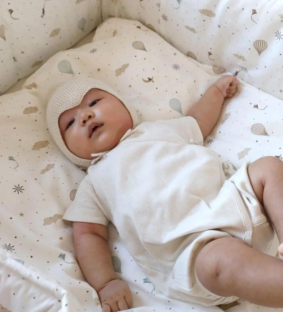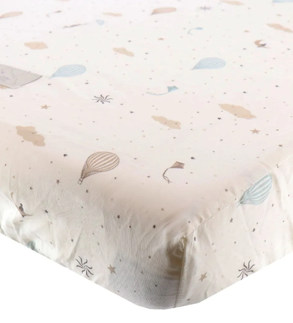 Skønt Cam Cam Copenhagen stræklagen i hvid med et alloverprint af stjerner, skyer, luftballoner og drager.