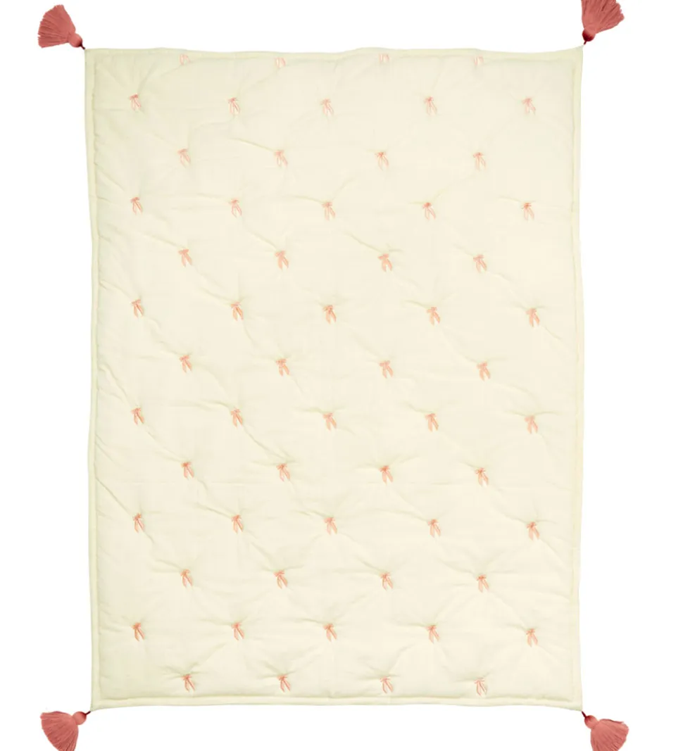 Skønt Cam Cam Copenhagen tæppe i lys rosa med rosa sløjfer. Tæppet har dekorative pomponer i hjørnerne, der giver et legende udtryk. Perfekt til ethvert børneværelse.