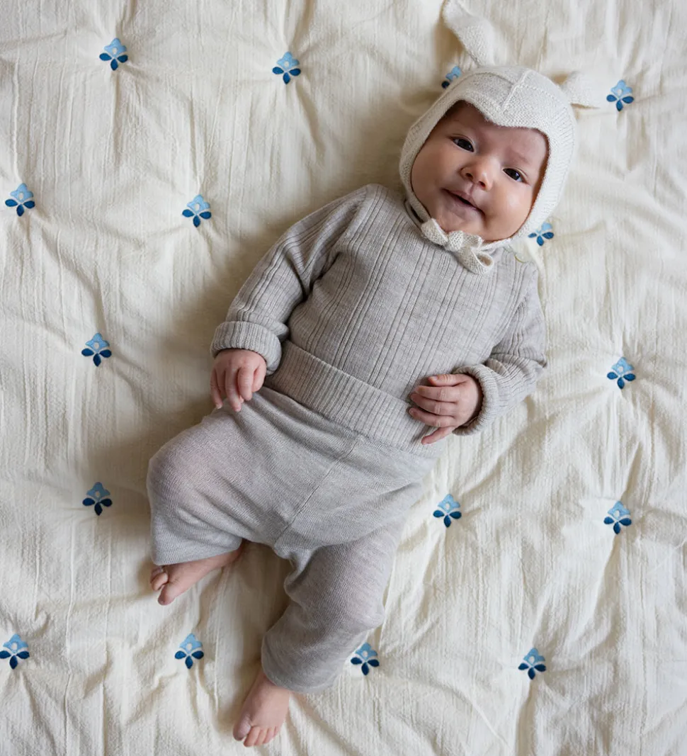 Flot Cam Cam Copenhagen tæppe i en lys råhvid tone med et elegant mønster af små blå blomster. Tæppet har fine pomponer i blå ved hjørnerne, hvilket tilføjer en charmerende detalje.