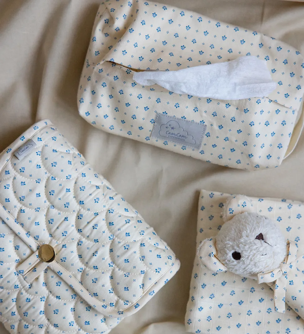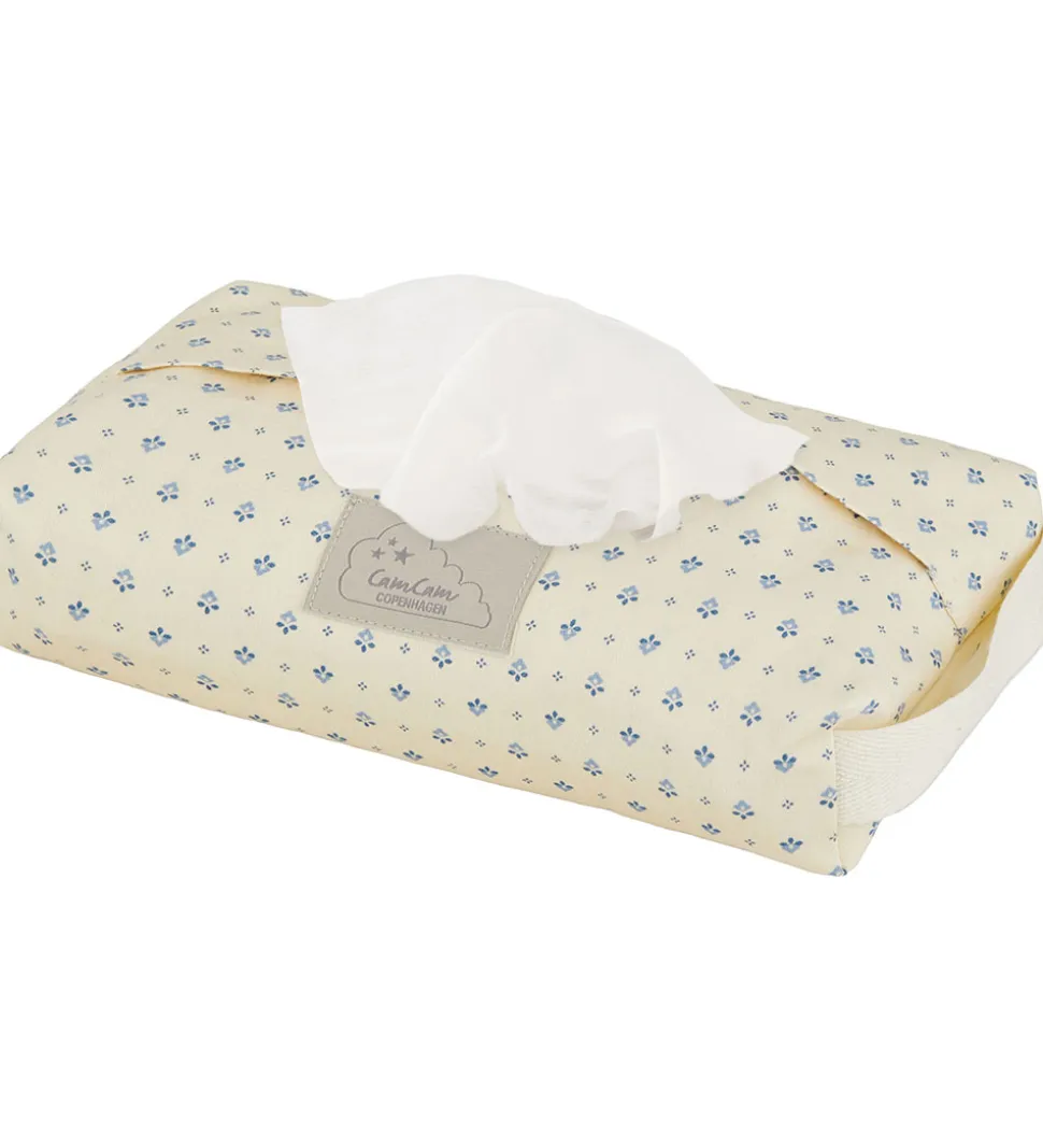Flot Cam Cam Copenhagen vådserviet etui i beige med et alloverprint af fine, små blomster i blå nuancer