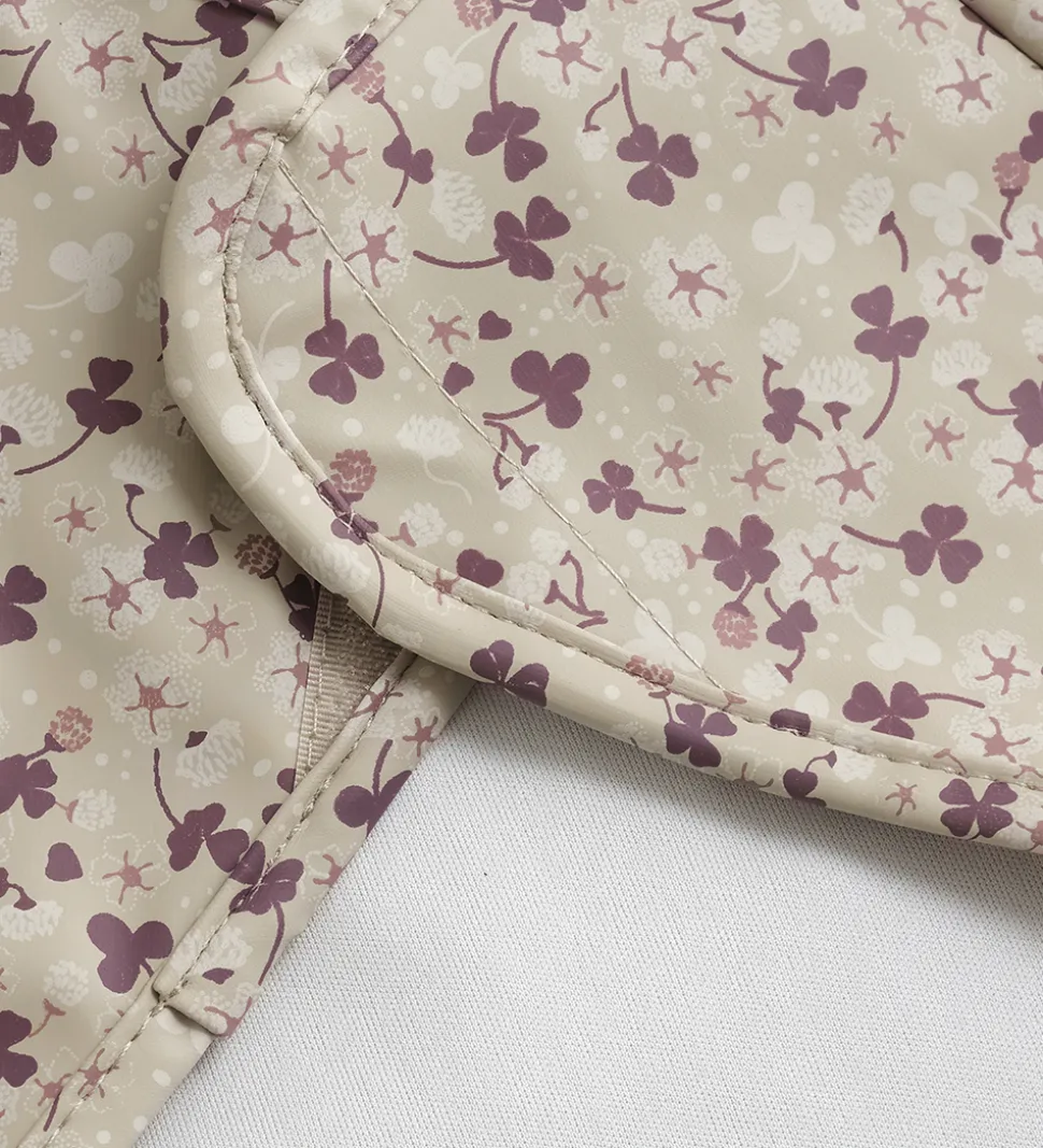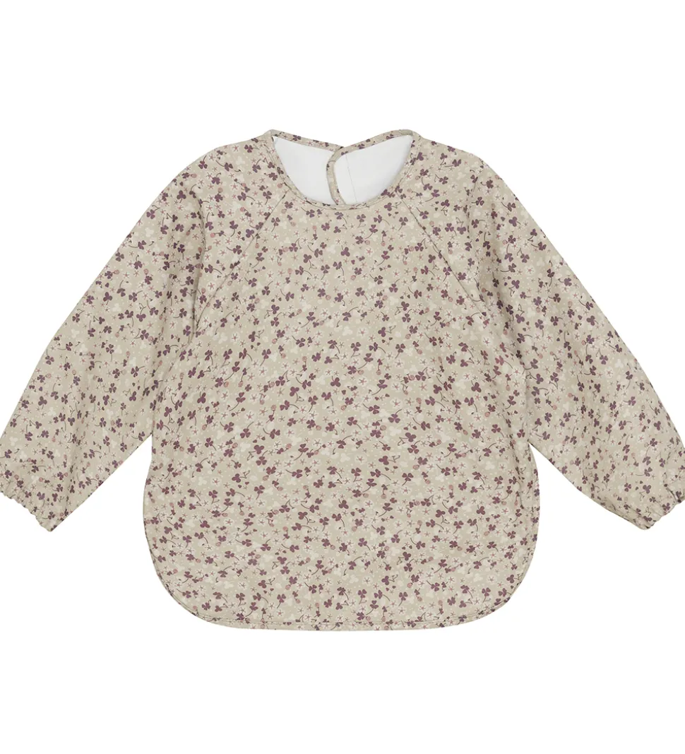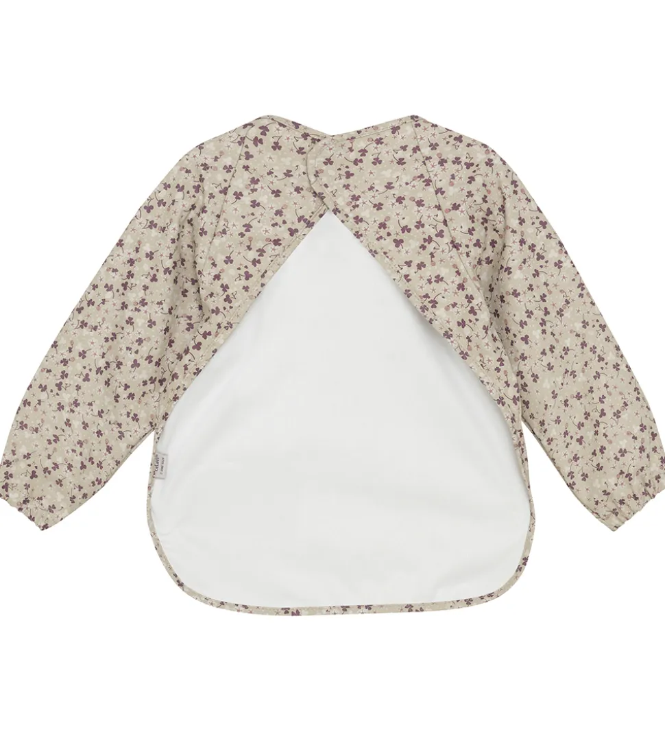 Flot CeLaVi forklæde i beige med alloverprint af blomster i hvid og lilla. Forklædet har lange ærmer med smalle elastikkanter ved håndleddende. Det lukkes i nakken med velcro. Forklædet har en PU-coating, som gør den vandtæt og let at tørre af.