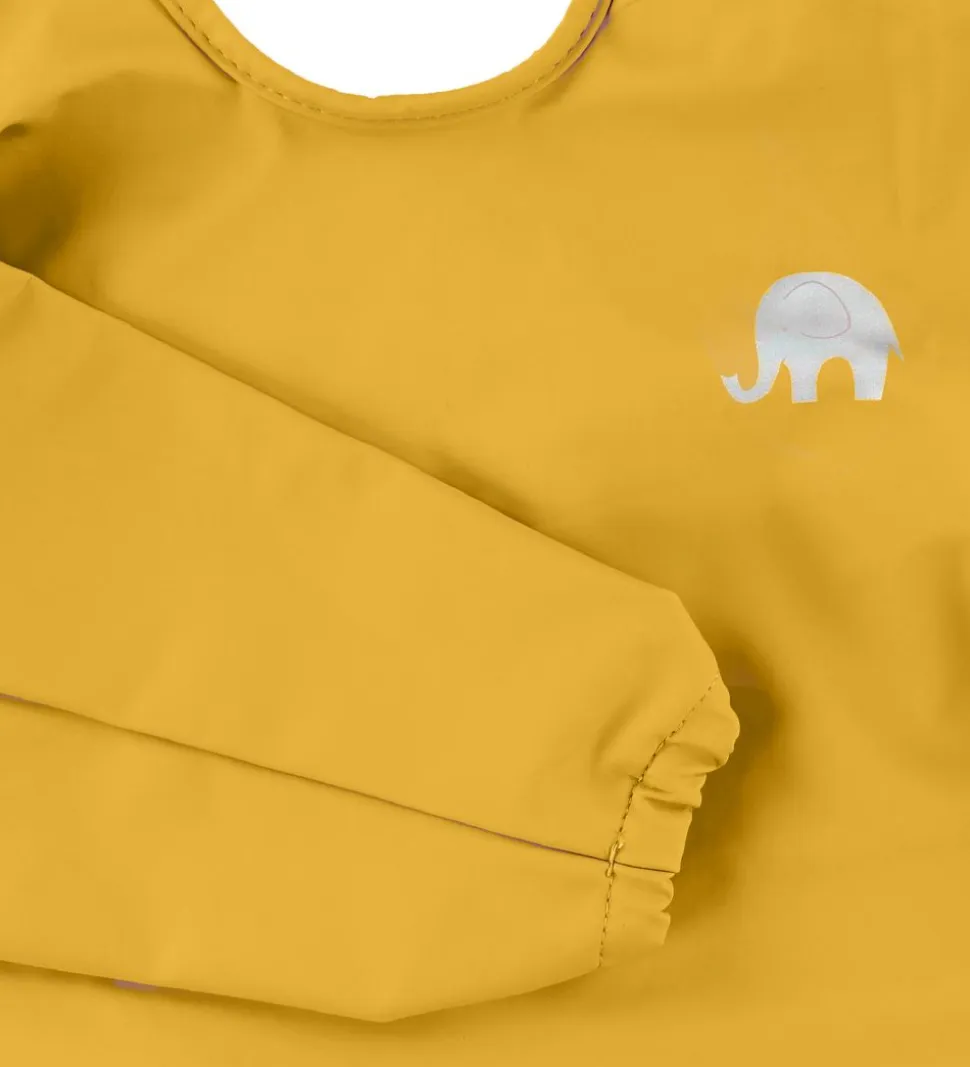 Praktisk CeLaVi forklæde i karrygul med et refleksprint af CeLaVis velkendte elefant på venstre bryst.