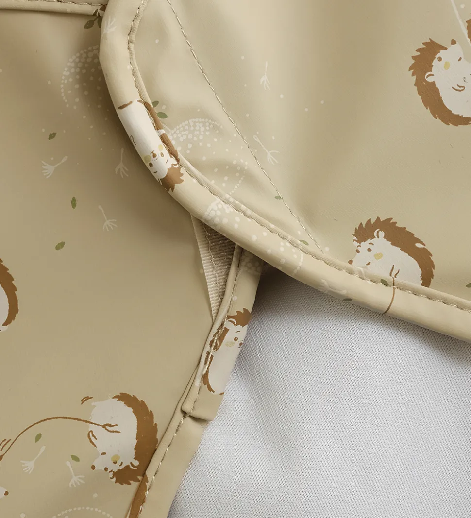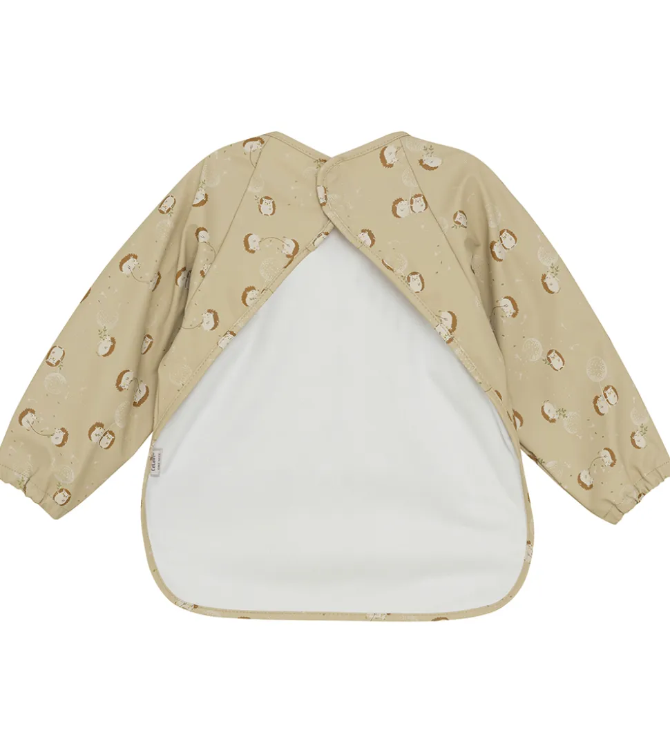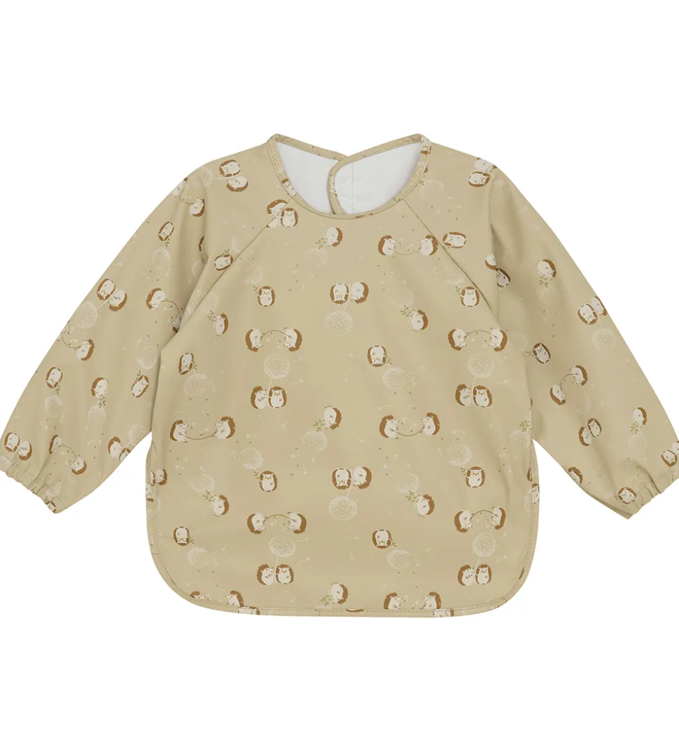 Fint CeLaVi forklæde i lysebrun med alloverprint af små pindsvin som holder mælkebøtter. Forklædet har lange ærmer med smalle elastikkanter ved håndleddende. Det lukkes i nakken med velcro. Forklædet har en PU-coating, som gør den vandtæt og let at tørre af.