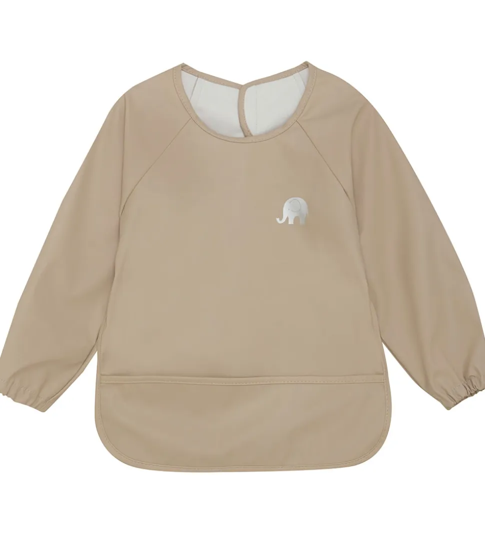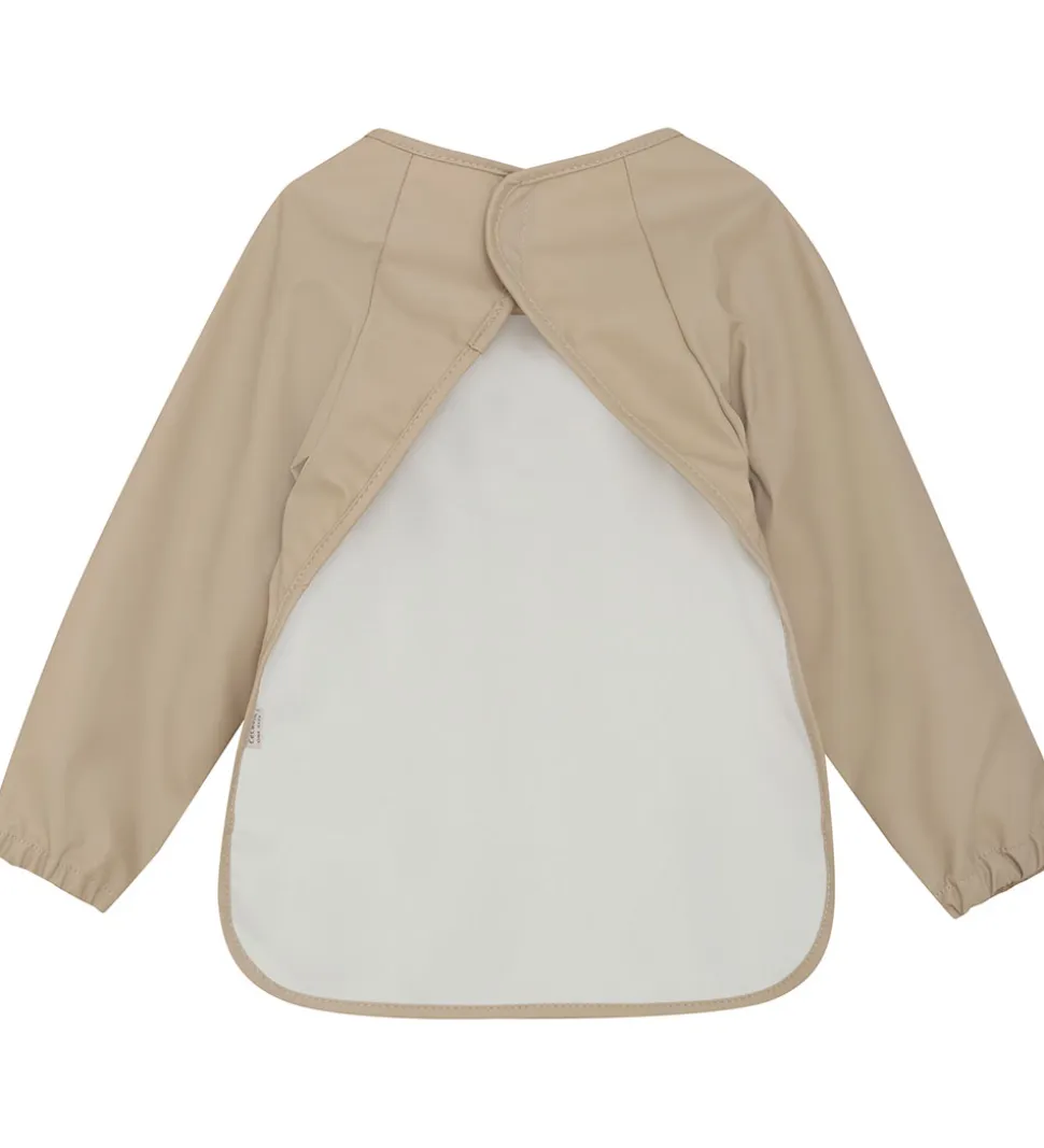 Fint CeLaVi forklæde i beige med et reflekslogo i venstre side. Forklædet har lange ærmer med elastik ved håndleddene. Det lukkes i nakken med velcro, og nederst er der en praktisk opsamlingslomme. Forklædet har en PU-coating, som gør det vandtæt og let at tørre af.