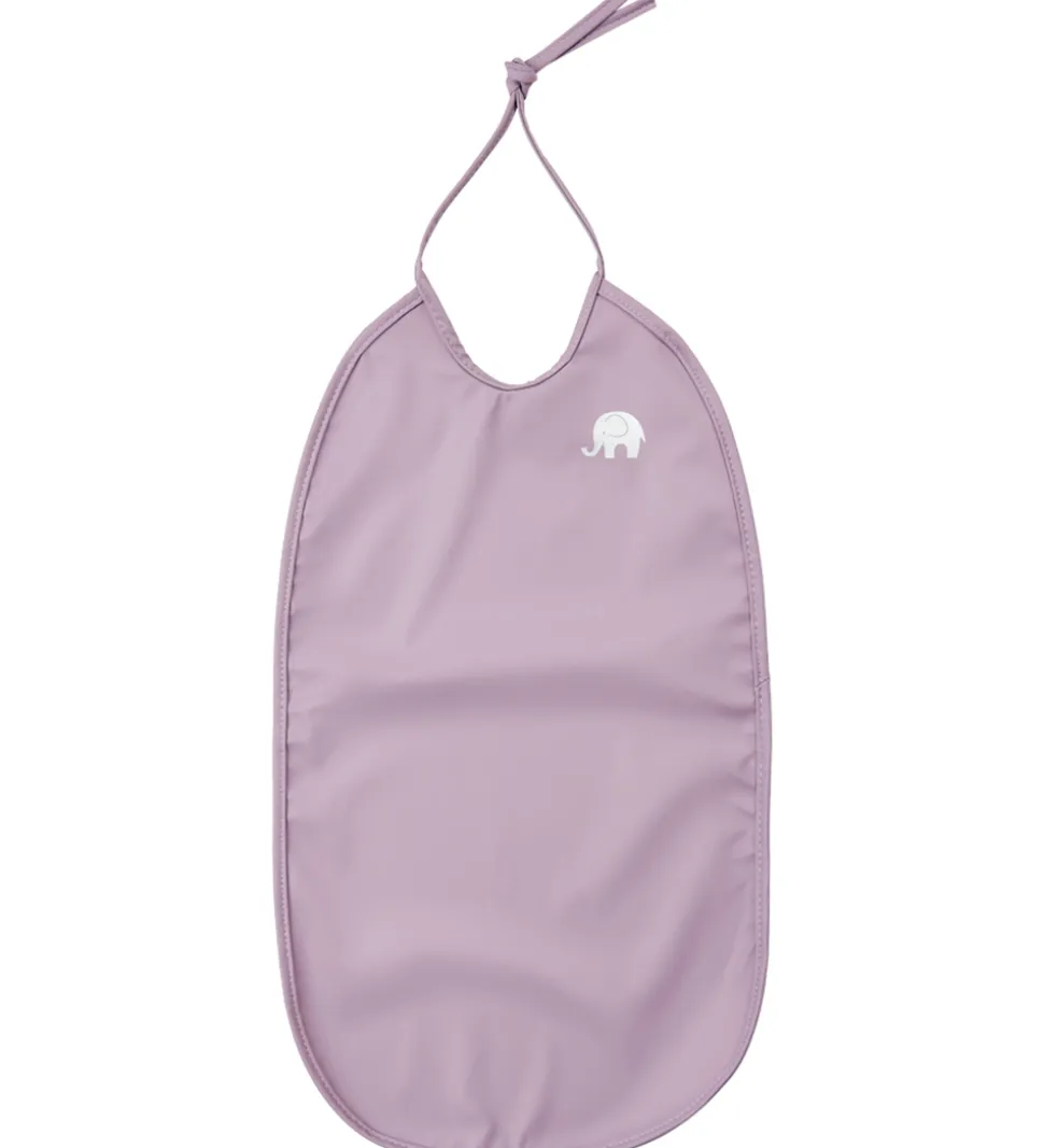CeLaVi hagesmækken er en lang model, og den bindes i nakken med et bindebånd. Hagesmækken har en PU-coating, der gør den vandtæt og nem at tørre af.