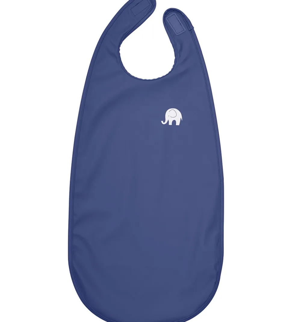 Fin CeLaVi hagesmæk i mørkeblå med et logoprint i refleks i venstre side. Hagesmækken er en lang model, som lukkes med velcro i nakken. Hagesmækken har en PU-coating, som gør den vandtæt og let at tørre af.