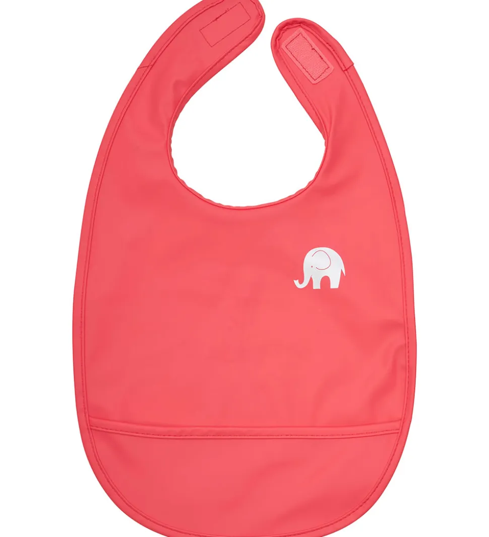 Smart CeLaVi hagesmæk i rød med et logoprint i refleks på fronten. Den lukkes i nakken med velcro. Hagesmækken har en PU-coating, som gør den vandtæt og let at tørre af.