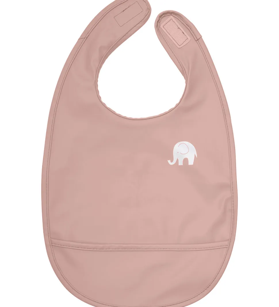 Skøn CeLaVi hagesmæk i støvet rosa med et logoprint i refleks på fronten. Hagesmækken lukkes i nakken med velcro og har en praktisk opsamlingslomme nederst. Hagesmækken har en PU-coating, som gør den vandtæt og let at tørre af.