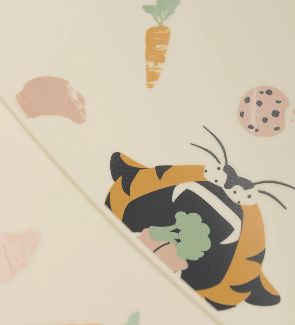- Cremehvid med et print fortil af en tiger, der spiser grøntsager og bagværk
