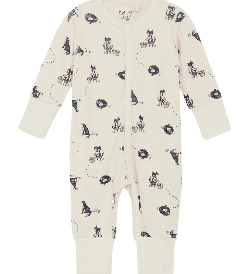 Charmerende CeLaVi heldragt i en lys beige nuance med et sødt print i blå med forskellige dyr og kurve med frugt.