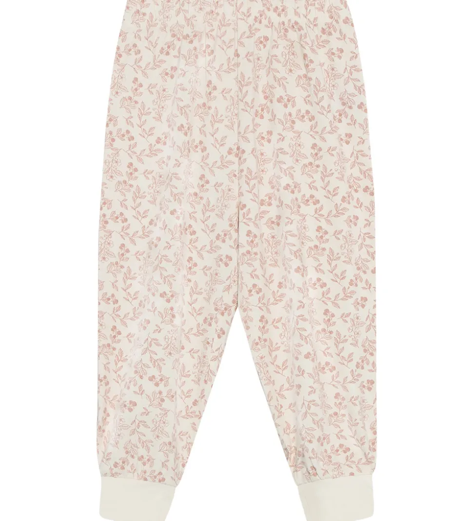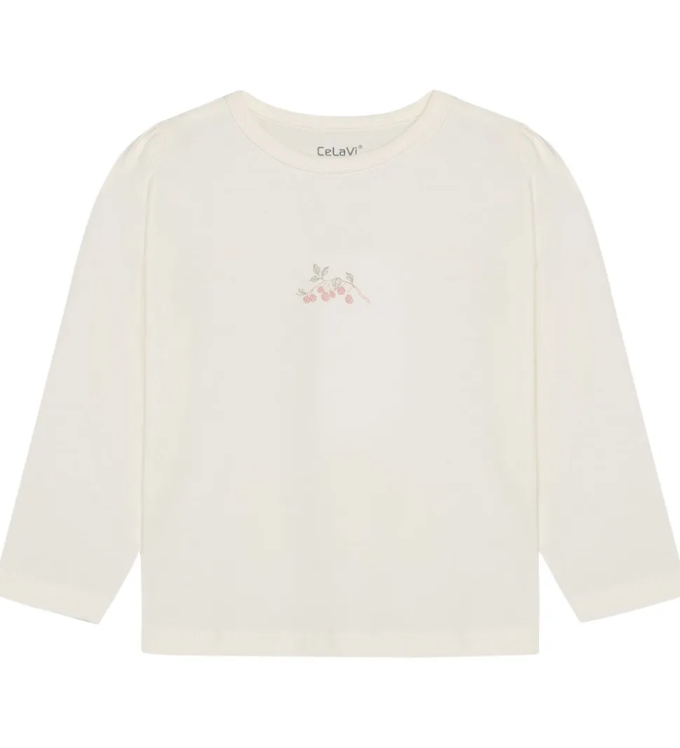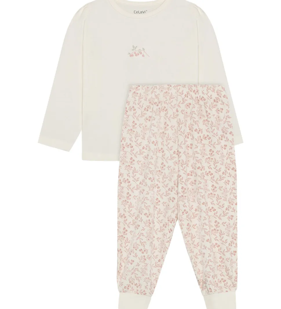 Sødt CeLaVi nattøj i hvid og rosa bestående af en natbluse og et par natbukser. Natblusen har et lille print af bær på brystet og lange ærmer med rynker ved skuldrene. Natbukserne har et alloverprint af bær, blomster og blade. I taljen er der en god elastik, og i benåbningerne er der brede ribkanter.