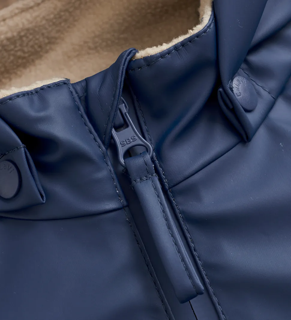 CeLaVi regndragten åbnes fortil med lynlås med hagebeskytter og indvendig vindstolpe. Regndragten er varmt vatteret og har et glatvævet for med lodrette syninger.