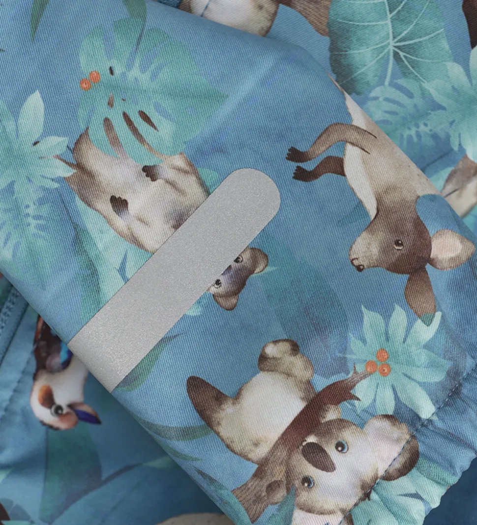 Yderst på ærmerne er der praktiske refleksstriber, og nederst på ryggen er der et refleksprint formet som en koala.