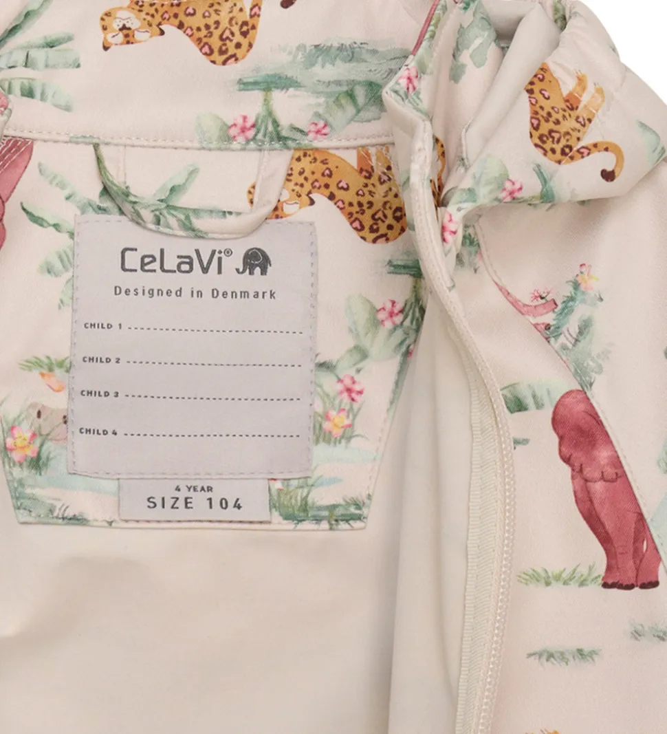 Sød CeLaVi softshelljakke i creme med et print med rosa elefanter sammen med orange leoparder, grå flodheste og planter i grønne nuancer.
