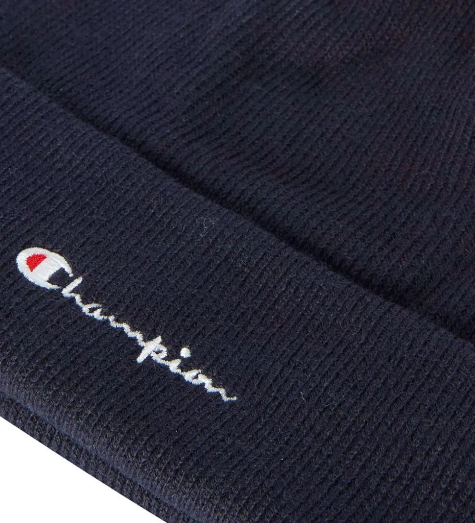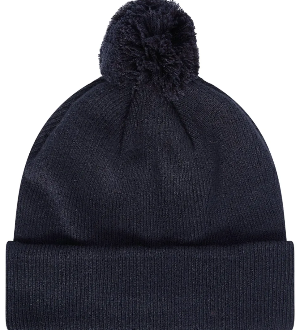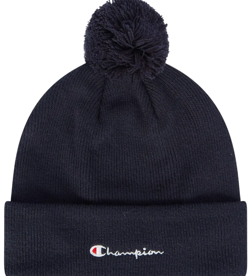 Skøn Champion hue i ensfarvet navy i en strikket kvalitet og med en flot pompon i toppen. Huen har et bredt ombuk langs kanten, og den består af to lag med bomuldsjersey på indersiden.