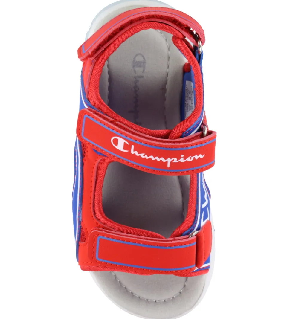 Skønne Champion sandaler i rød og blå med et Champion logo på velcroremmen og på ydersiden. Sandalerne har en hvid og blå ydersål med blinkende effekt, som kan aktivieres når barnet går eller løber.