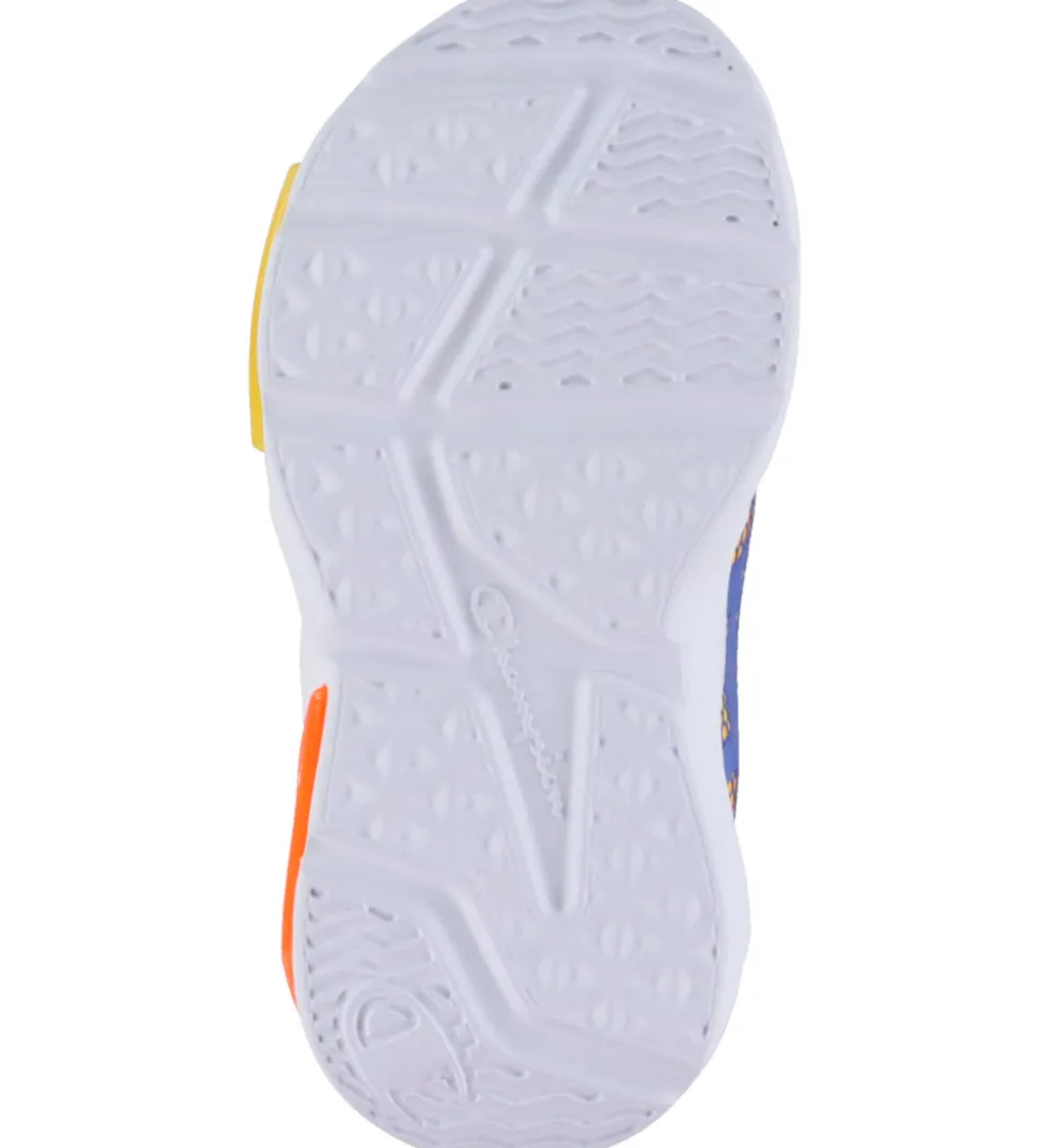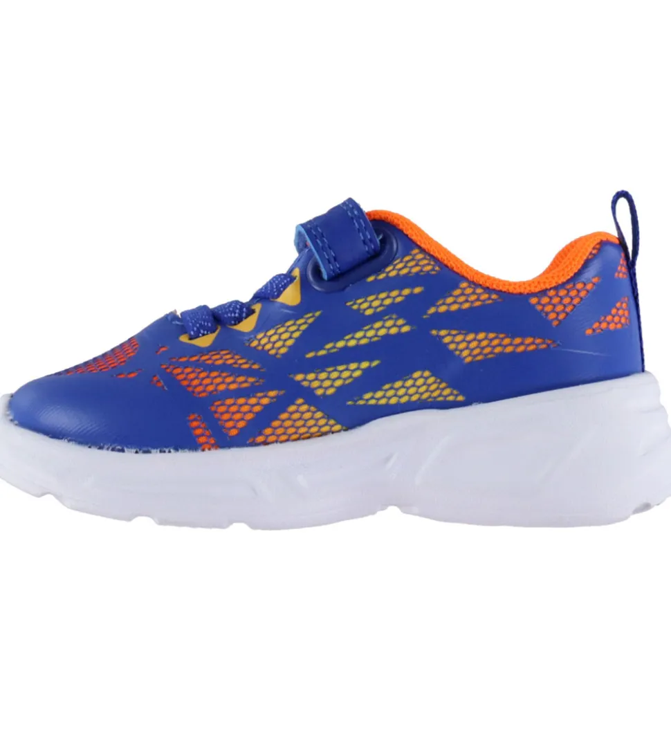 Smarte Champion sko i blå, orange og gul med et reflekslogo på ydersiden. Skoene har indbygget LED-lys i ydersålerne, som aktiveres når man går og løber.