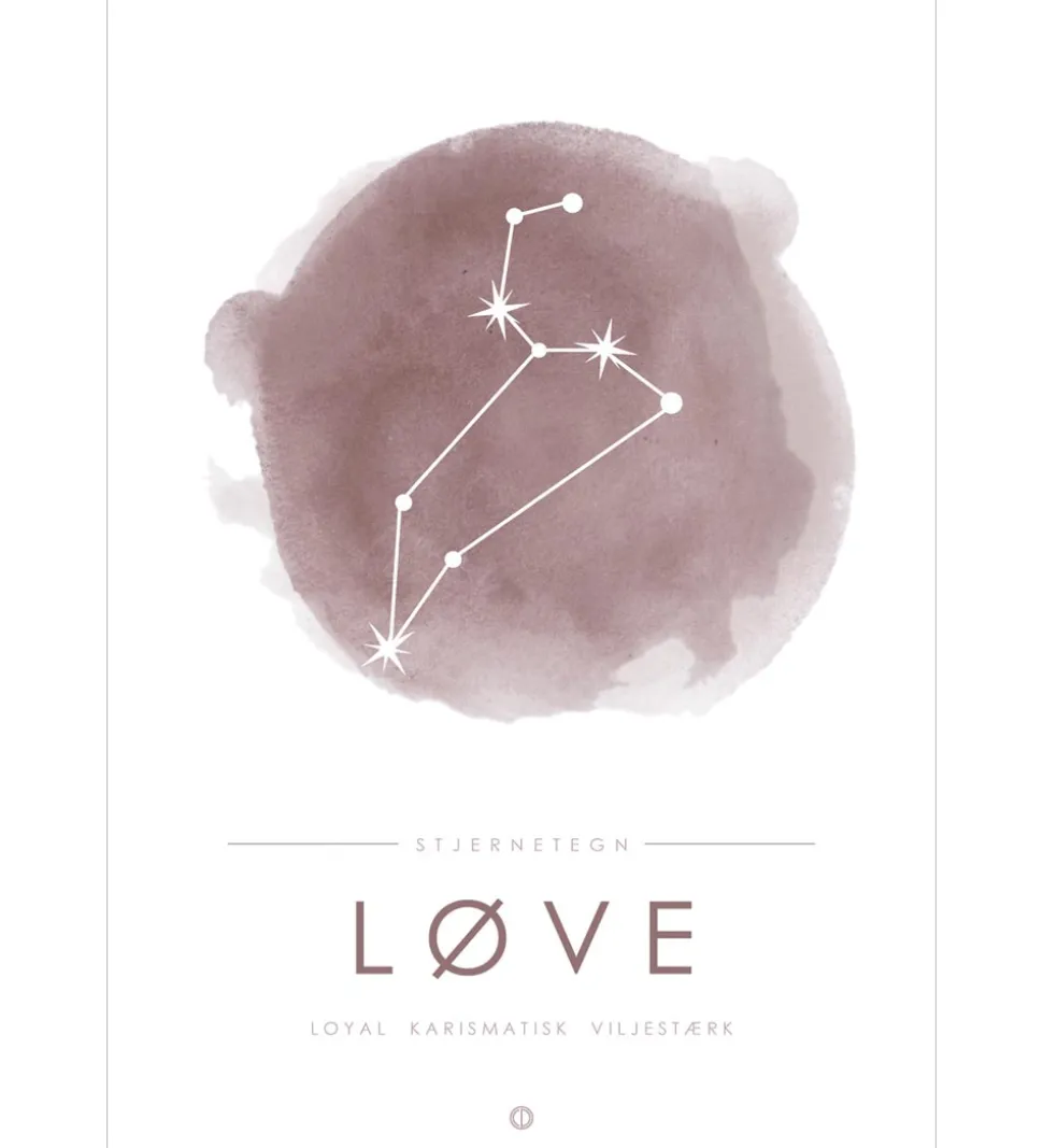 Fin Citat plakat i hvid med stjernetegnet Løve i rosa nuancer. Øverst er stjernebilledet, og under er teksten “Løve” samt personlige træk som er forbundet med stjernetegnet.