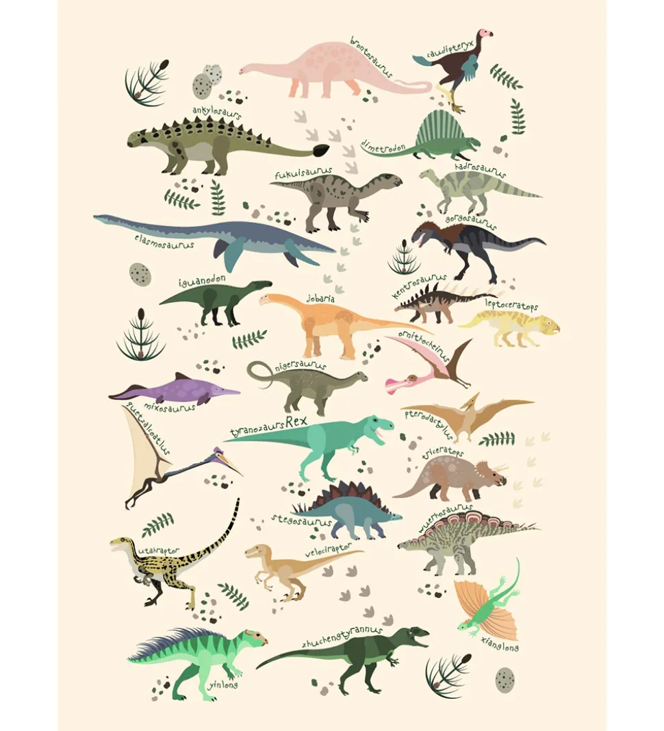 Skøn Citat plakat i beige, med en masse forskellige dinosaurer og deres navn i fine farver.