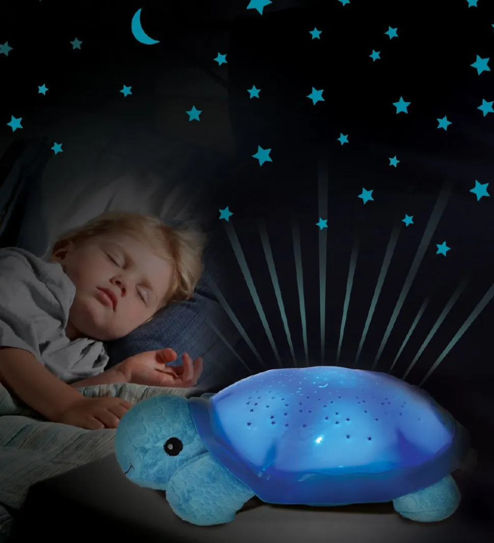 Skildpadden har stjerner på skjoldet, som kan projektere 8 virkelige stjernebilleder op i loftet i blå, grønne og gule farverpå skiftende vis. Der medfølger en guide til stjernebilleder, så det er muligt at finde dem alle sammen med barnet. En hyggelig lille aktivitet inden sengetid at sidde og pege ud sammen.