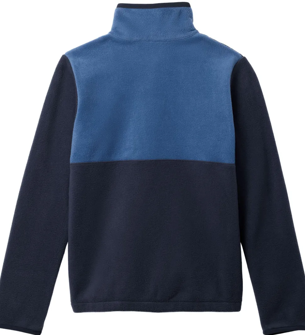 Flot Columbia fleecejakke i blå og navy fleece med glatvævede kanter i navy. Fleecejakken har et logo på venstre bryst.