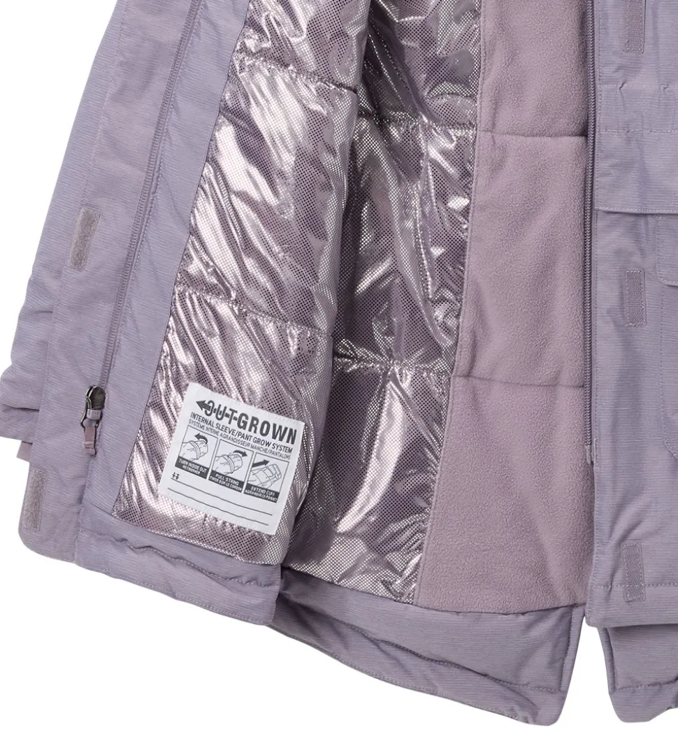 Columbia vinterjakken åbnes med en lynlås med udvendig vindstolpe, som lukkes med velcro og en trykknap i toppen. Vinterjakken har store, fleeceforede klaplommer, som lukkes med trykknapper, og oven over lommerne er der en praktisk lægdetalje. Livåbningen har en lille slids bagtil og high/low-effekt.