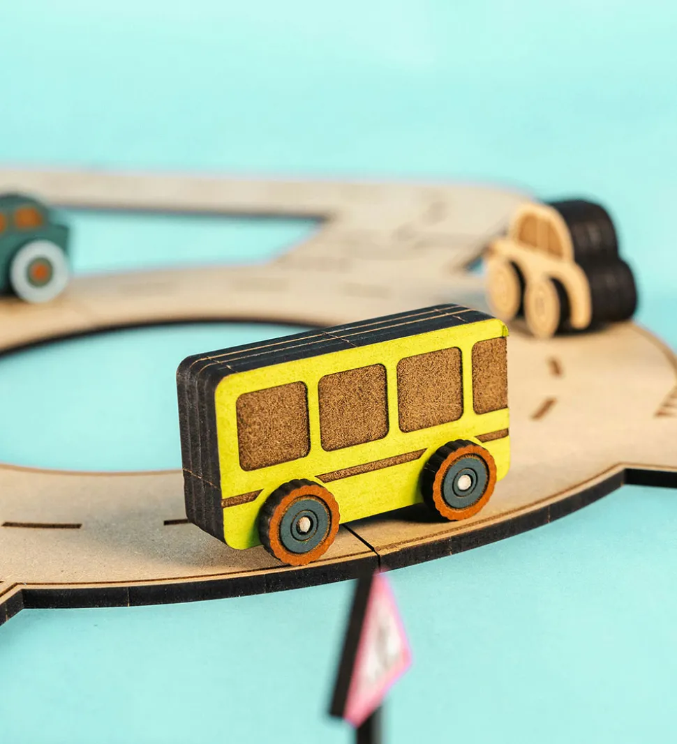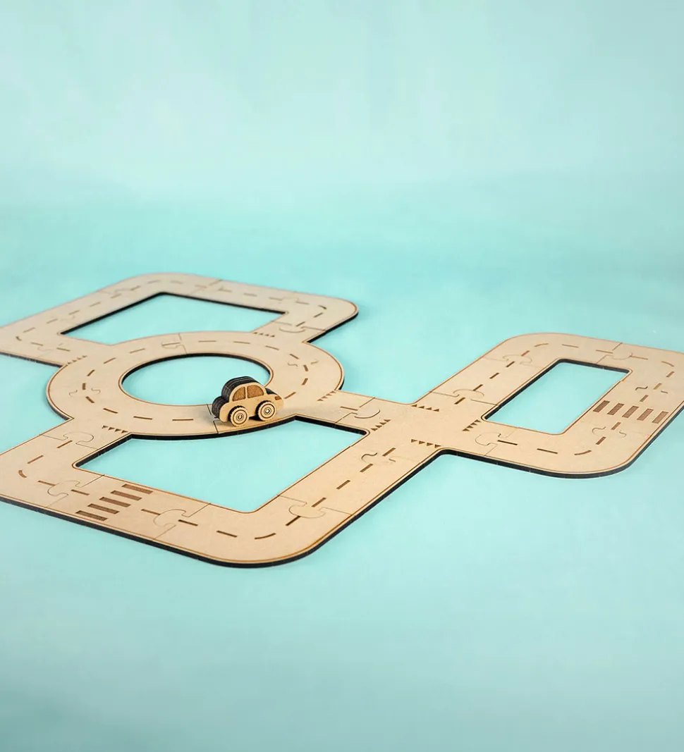 Med Crateit sættet kan du bygge din egen vej og rundkørsel, samt er træet ufarvet og du skal derfor selv farvelægge det. Det kan farves med alle typer af tusser, maling eller farveblyanter.