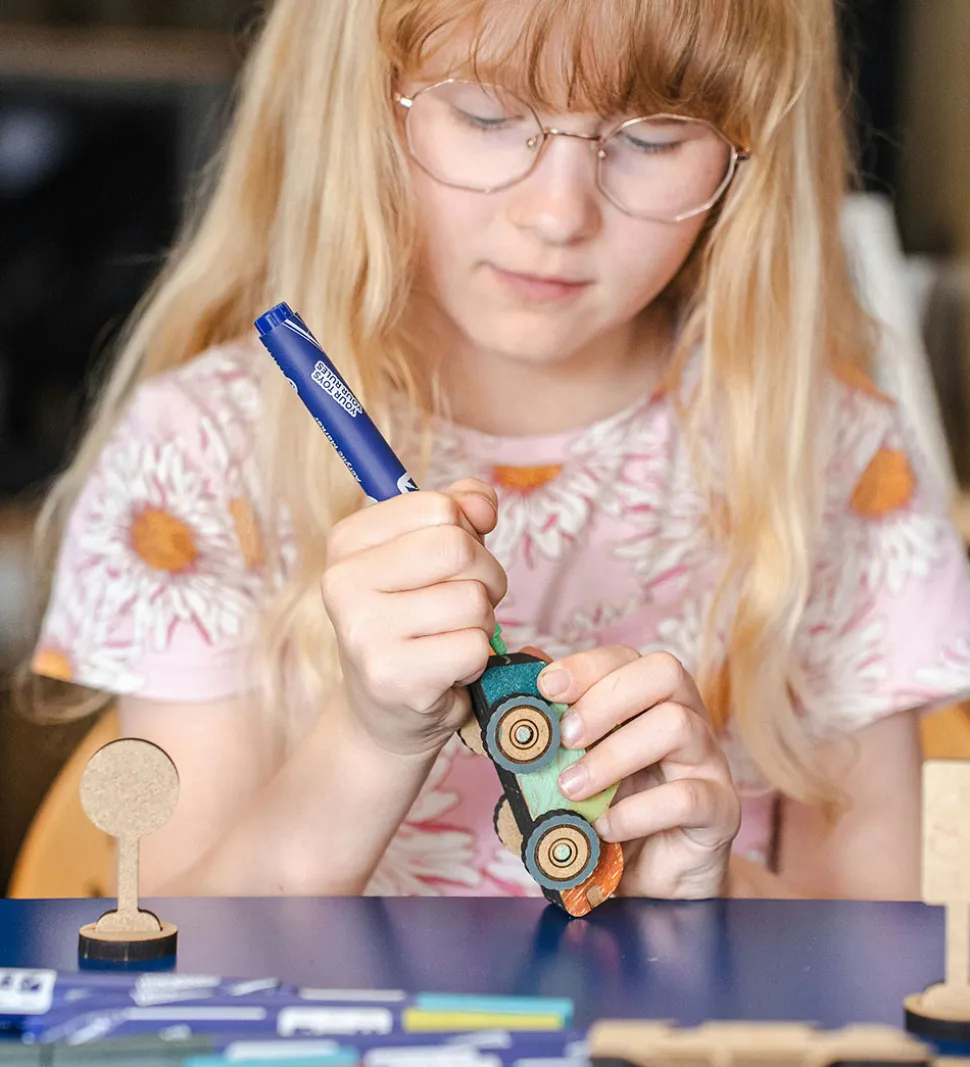 Smart kreasæt fra Crateit der indeholder 20 dele, heriblandt en lille bil.