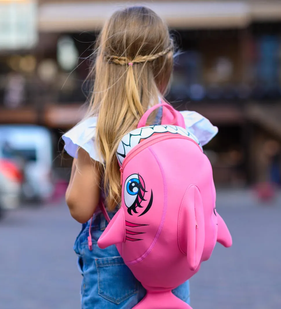 Skøn Crazy Safety børnehavetaske i rosa neopren med et print, så dem ligner en haj.