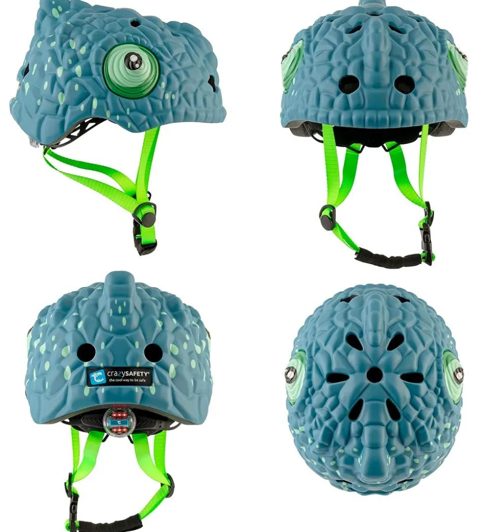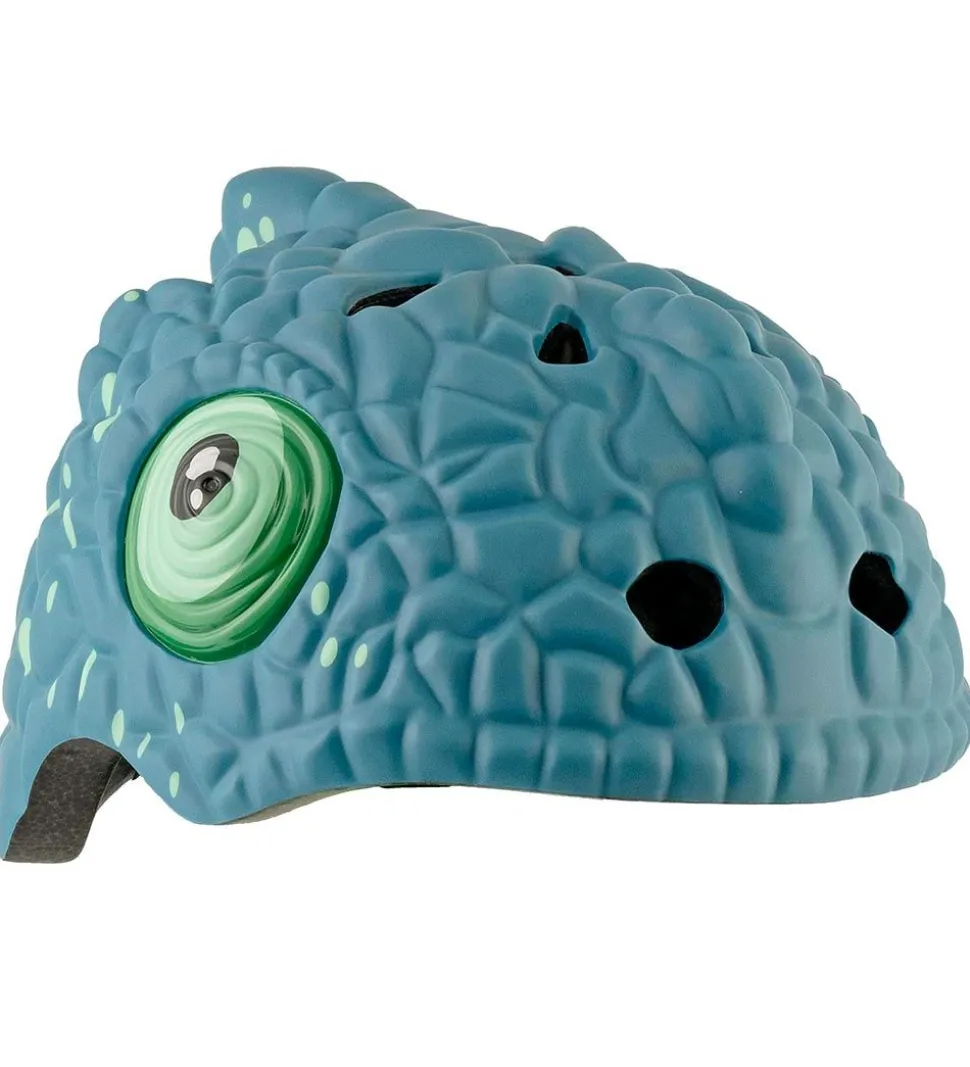 Sød Crazy Safety cykelhjelm i mørkeblå og grøb og med form som en kamæleon.