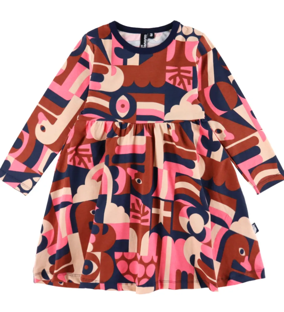 Elegant Danefæ kjole med et farverigt og geometrisk mønster i primært rosa og navyblå. Kjolen har en rund halsudskæring og lange ærmer. Den er skåret ved taljen, hvor kjolens skørt får god vidde.