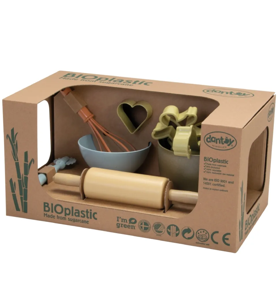 Dantoy bagesættet er en sjov tilføjelse til legekøkkenet, hvor der nu også kan blive bagt og serveret friskt bagværk, kage eller småkager i sandkassen eller til te-slabberas på børneværelset.
