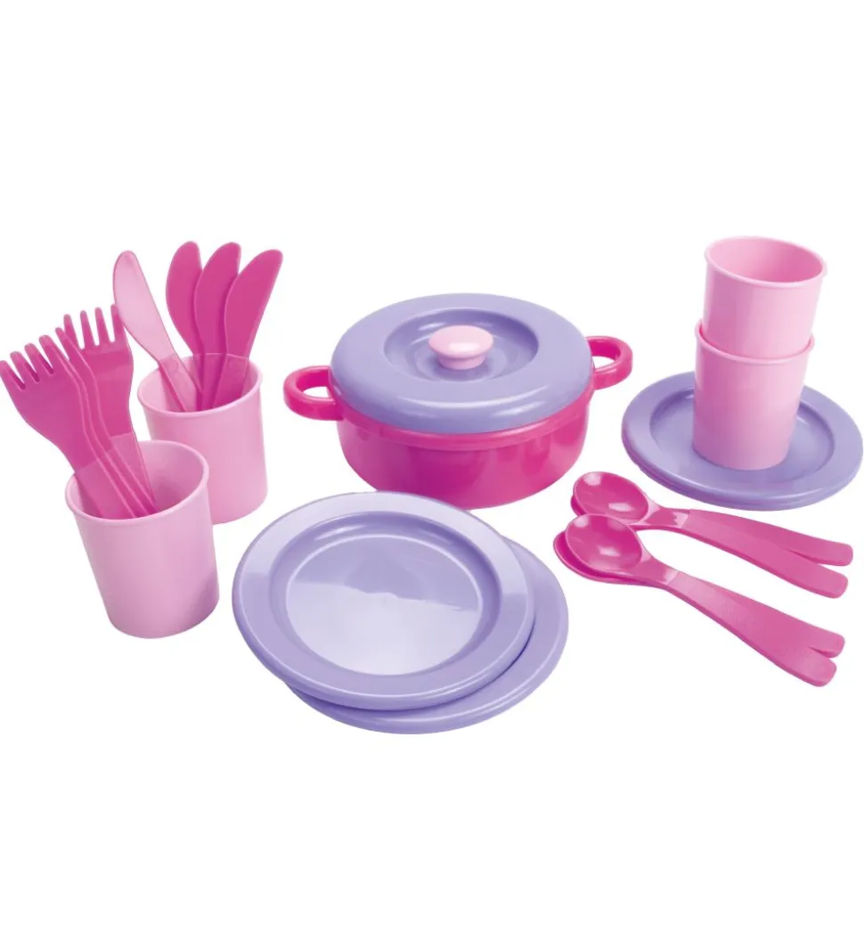 Skønt Dantoy-spisesæt fra My Little Princess-serien bestående af 22 dele i lilla og lyserøde nuancer.