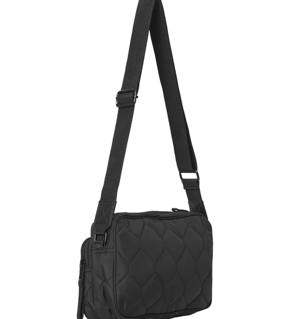 Fin DAY ET skuldertaske i sort med en quiltet struktur og et hvidt stofmærke fortil med teksten “DAY ET”.