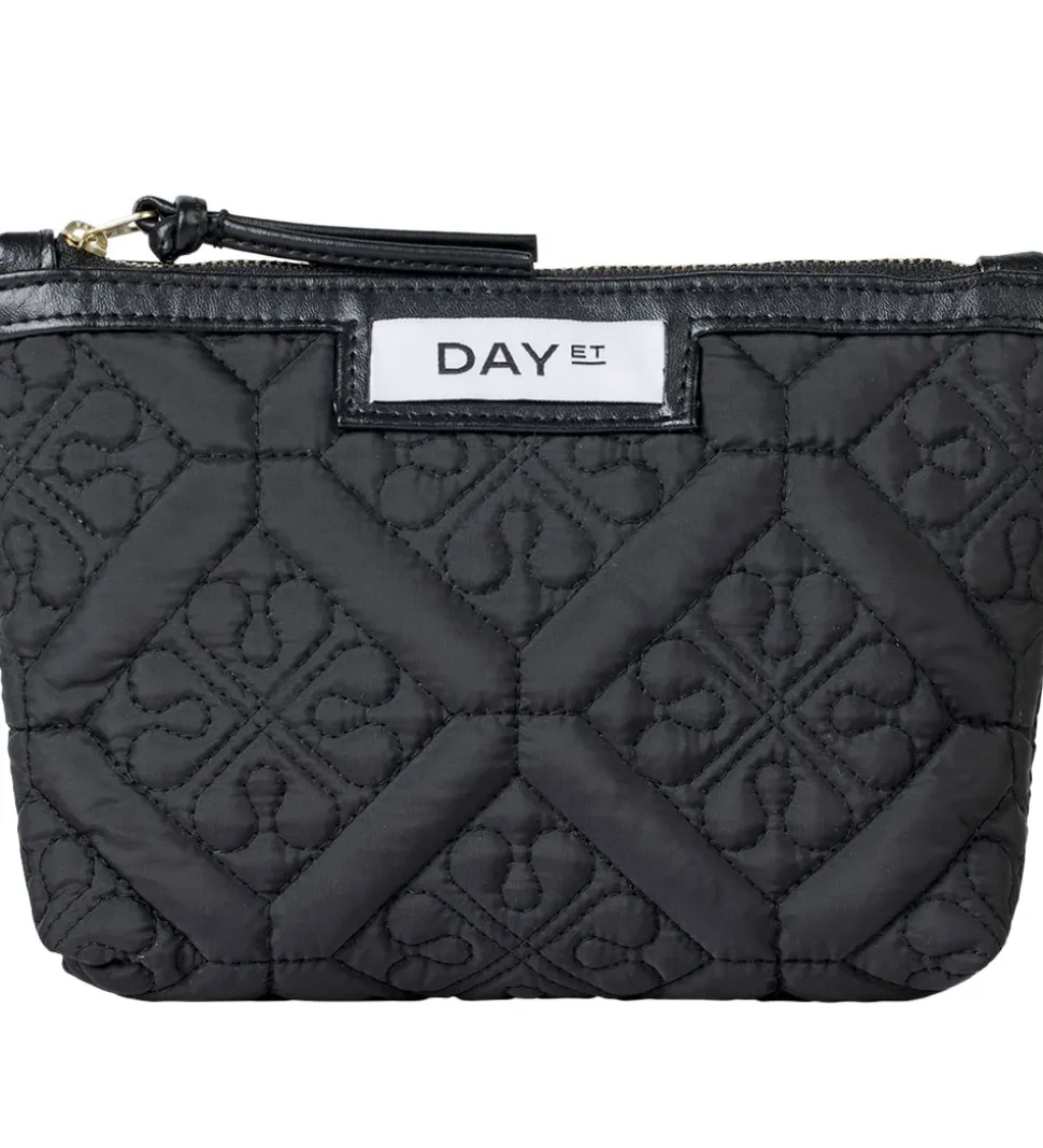 Fed DAY ET toilettaske i sort med en quiltet struktur i et fint mønster, og kanter i imiteret læder. På fronten er der et hvidt stofmærke med teksten “DAY ET”.