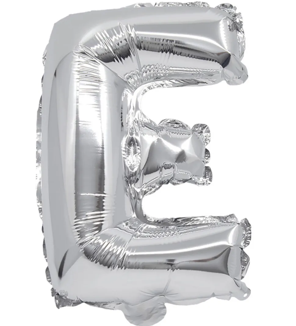 Flot Decorata Party foileballon i sølv med form som bogstavet “E”.