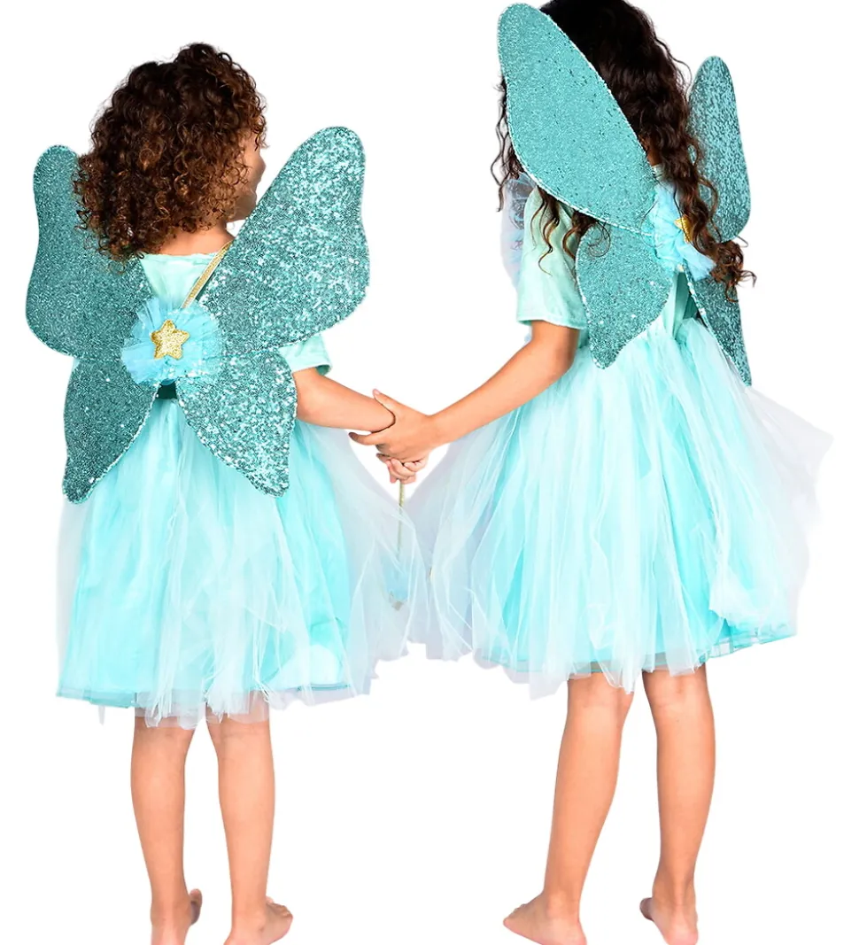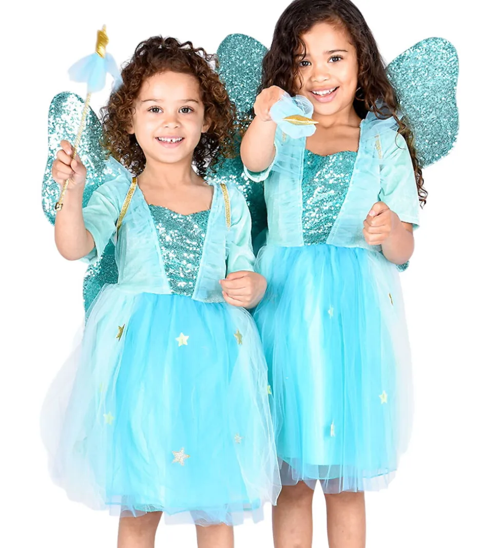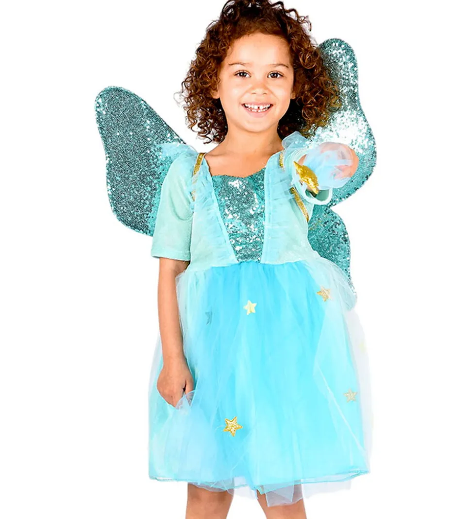Den Goda Fen udklædningen består af en kjole med tylskørt og pailletter, vinger med pailletter samt en tryllestav med en guldstjerne.