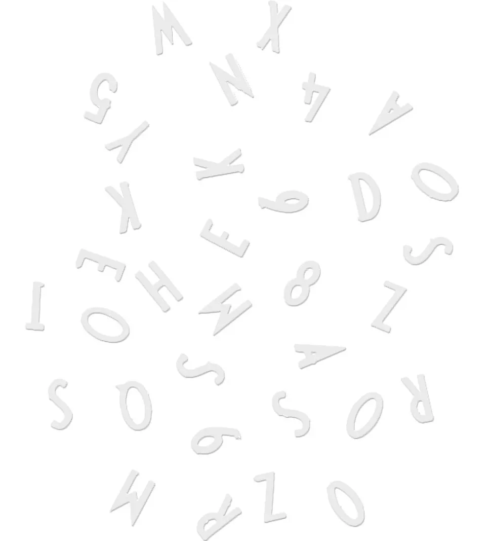 Små Design Letters bogstaver, tal og tegn i hvid, som passer til Design Letters tavlerne.