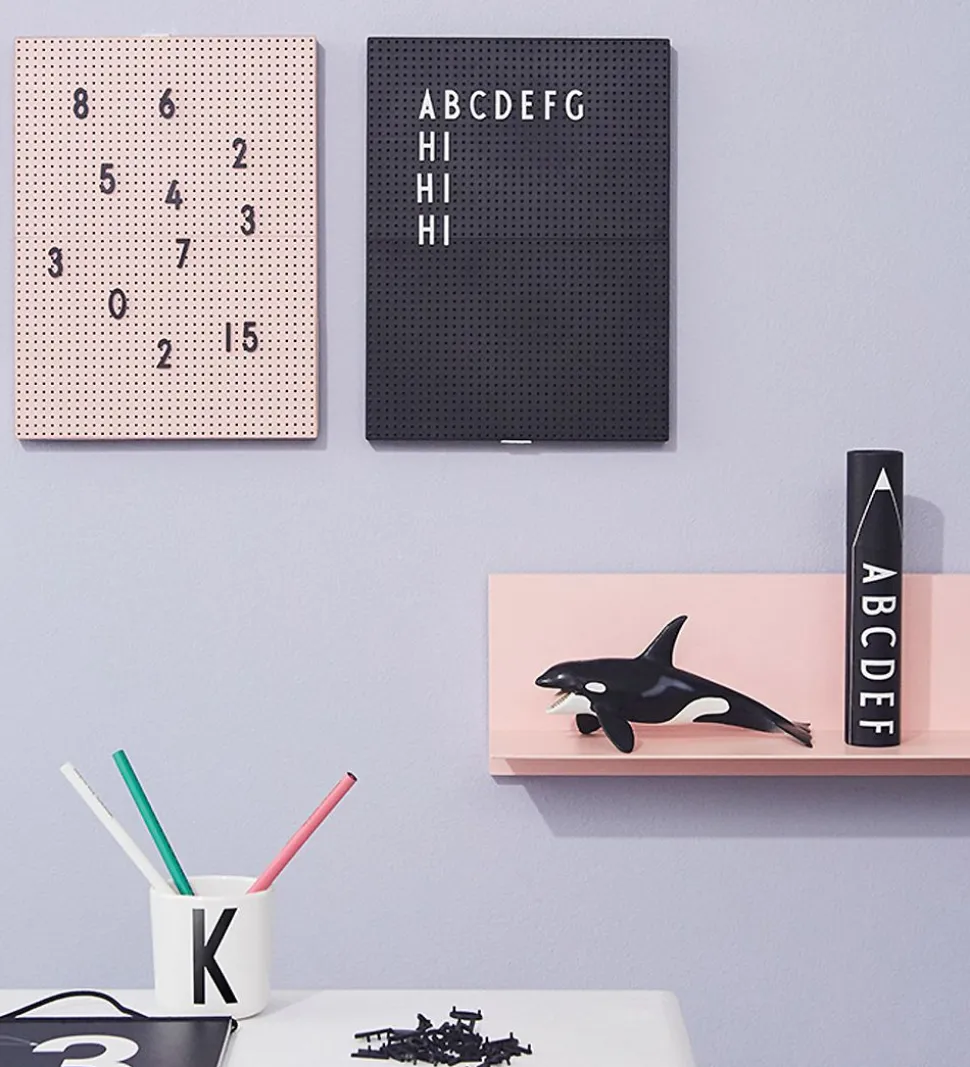Bogstavernes form har Arne Jacobsen designet i 1937. Brug bogstaverne til at skrive søde ord eller sjove citater på Design Letters tavlen, eller leg med tal og bogstaver sammen med børnene. Ideel som dekoration i køkkenet, stuen eller på børneværelset.