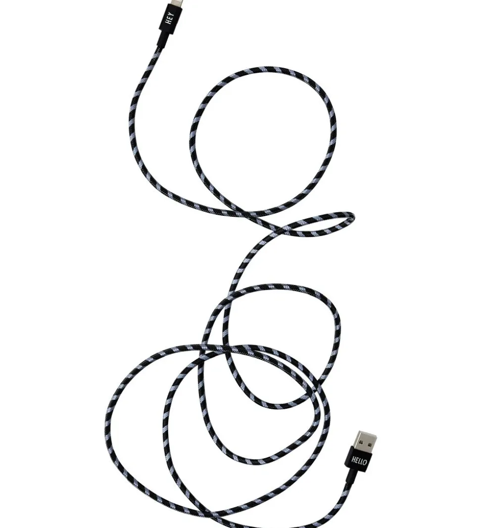 Flot Design Letters opladerkabel i sort og blåstribet med sorte stik, hvorpå orderne “Hey” og “Hello” er printet i hvid.