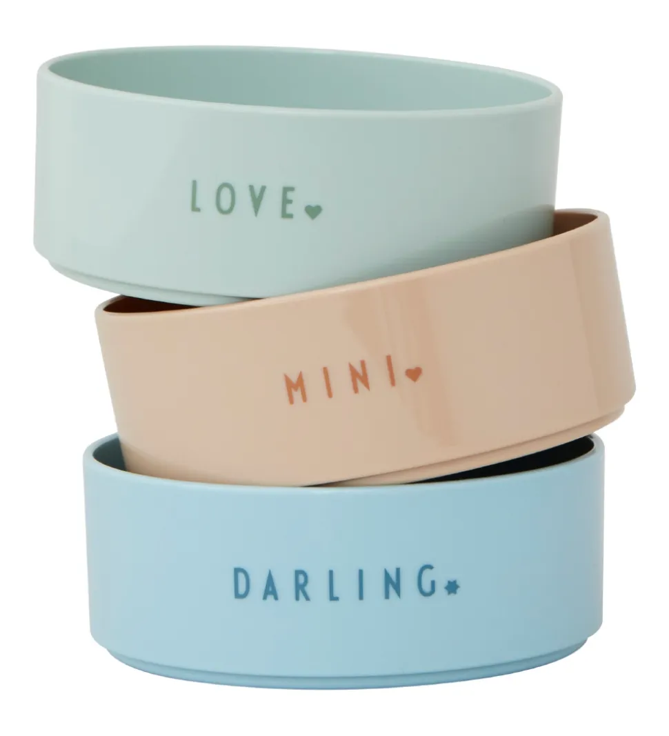 Flotte Design Letters skåle i grøn, brun og blå, dekoreret med “Love”, “Mini” og “Darling” samt små hjerter skrevet med Arne Jacobsens typografi på ydersiden af kanten.