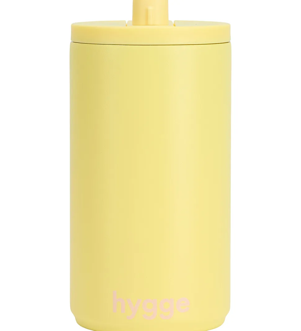 God Design Letters termokop i gul med ordet “hygge” trykt med store, rosa bogstaver langs bunden.