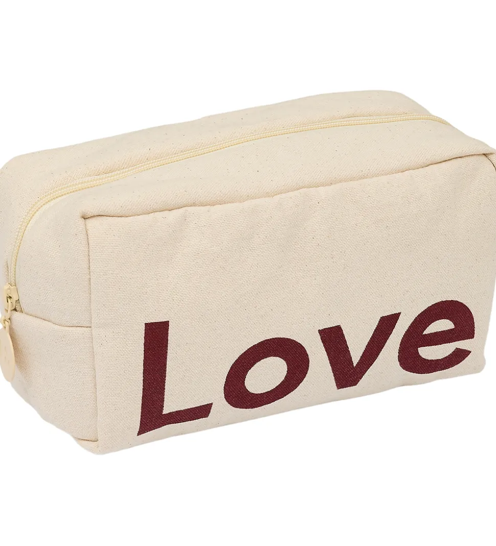 Lækker Design Letters toilettaske i naturfarvet bomuld, og på den ene side står der “LOVE” trykt i rødbrun.