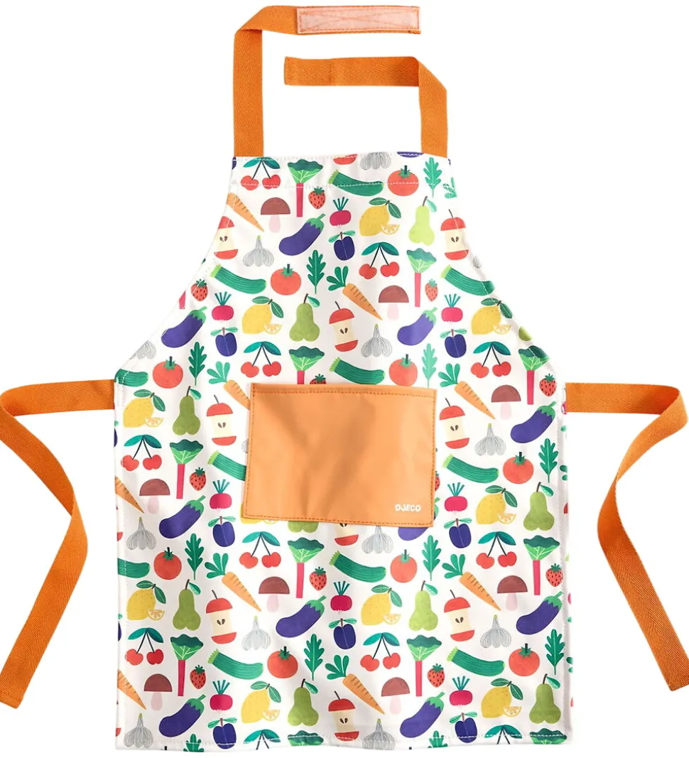 Praktisk Djeco forklæde uden ærmer i hvid med farverigt grøntsagsprint. Det har en stor lomme på fronten i orange. Djeco forklædet sikrer både funktionalitet og stil under madlavning.