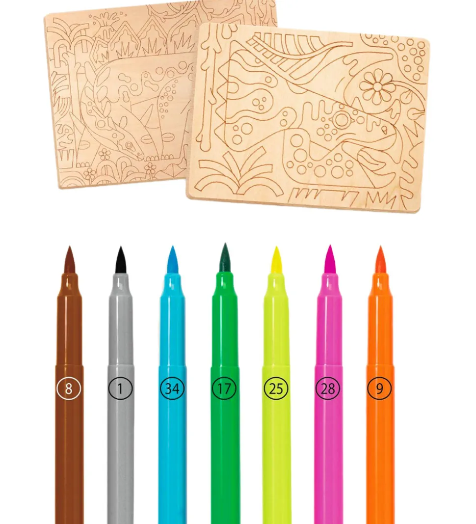 - 3 træplader i forskellige størrelser med illustrationer, der venter på at blive farvelagt