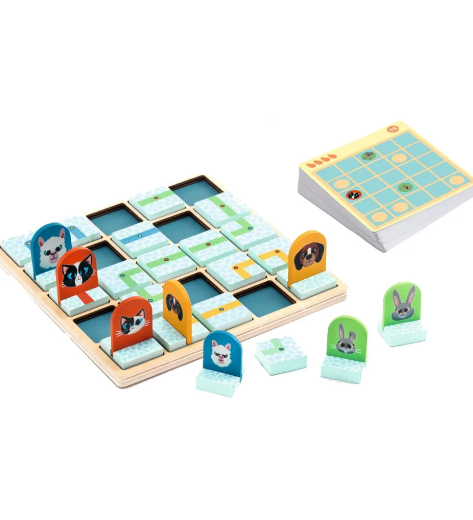 Djeco spillet går ud på at de små dyr skal finde vej tilbage til deres forældre, ved at vise dem vejen. Brikkerne er lavet af træ, så de ikke nemt går i stykker. Spillet lægger op til sjov og kreativitet for alle.