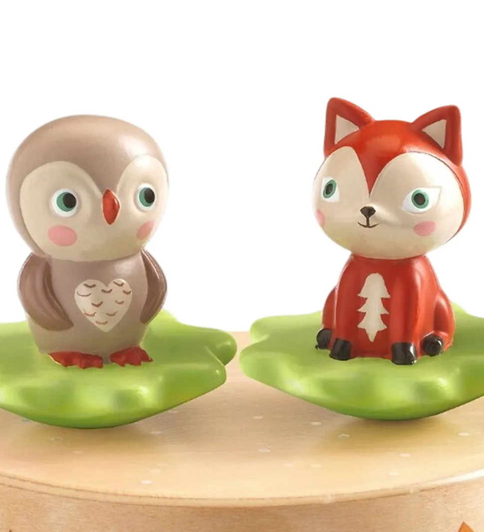 Djeco musikboksen har en rund form med korte blå ben. Ovenpå boksen er to magnetiske figurer, en ugle og en ræv, begge siddende på en grøn platform og som vipper og drejer når musikken spilles. Musik boksen bliver trukket op på bagsiden og spiller en velkendt Mozart-melodi .