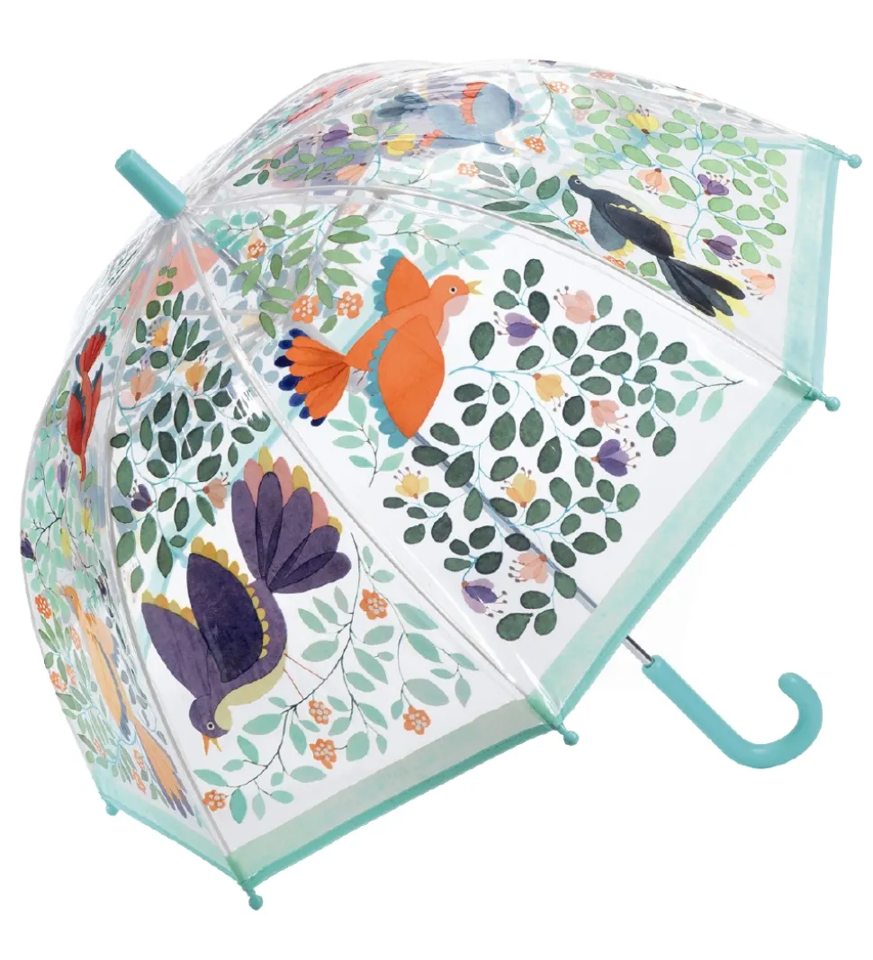Flot Djeco paraply i gennemsigtigt, blødt plast med print af fugle, blomster og blade og med et mintgrønt håndtag.