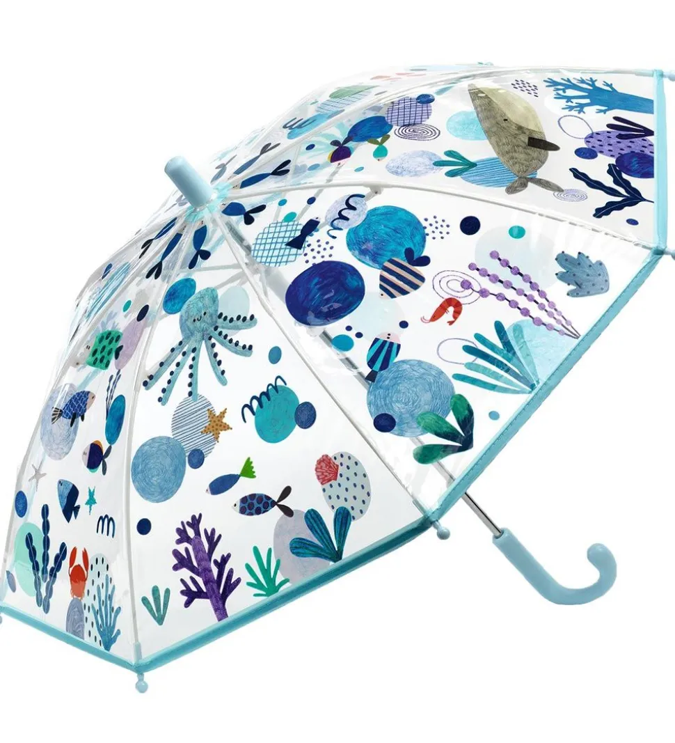 Flot Djeco paraply i gennemsigtigt, blødt plast med print af forskellige genstande og dyr fra under havet og med et lyseblåt håndtag.