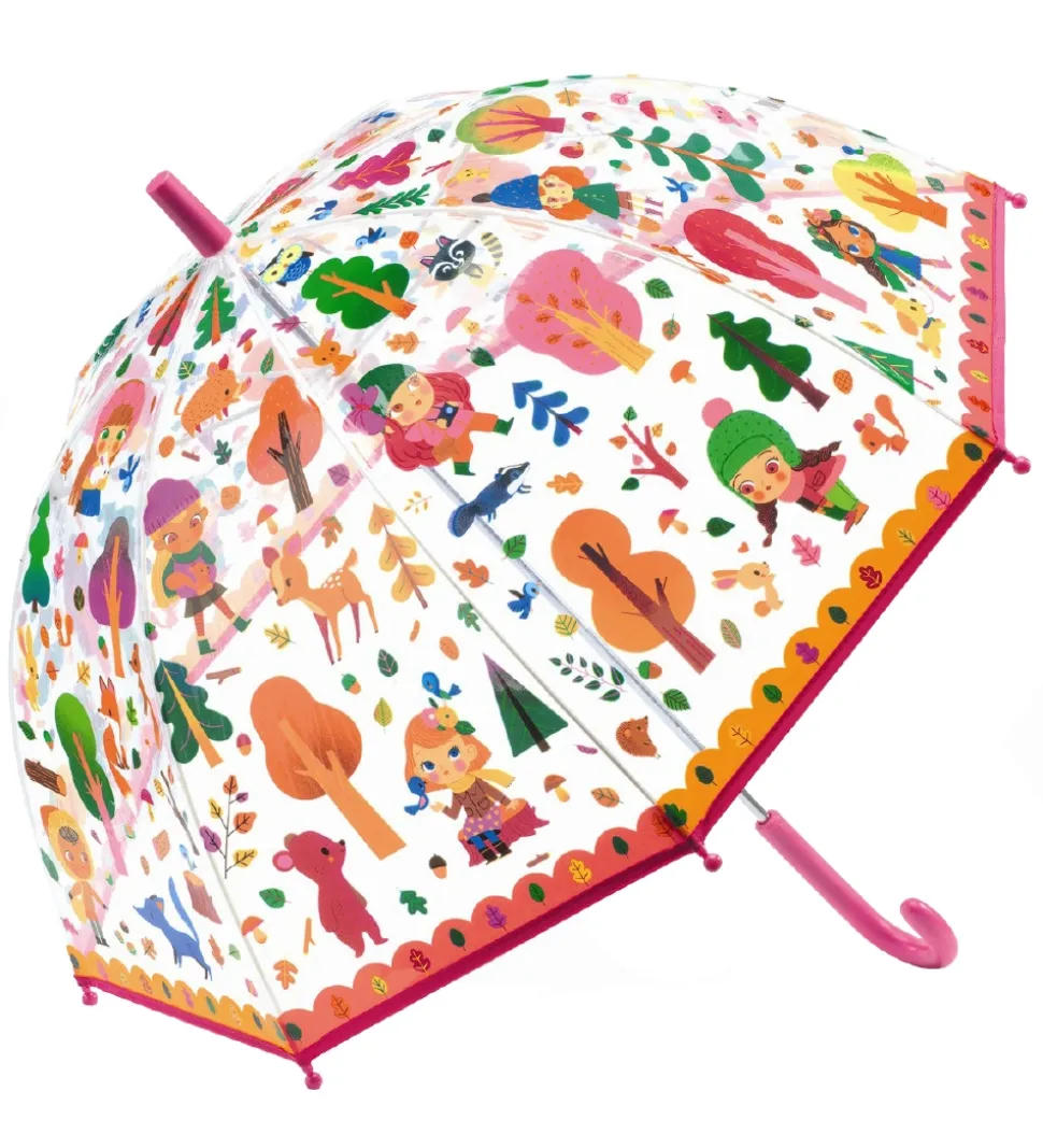 Skøn Djeco paraply i gennemsigtigt, blødt plast med print af træer, skovens dyr og piger og med et pink håndtag.